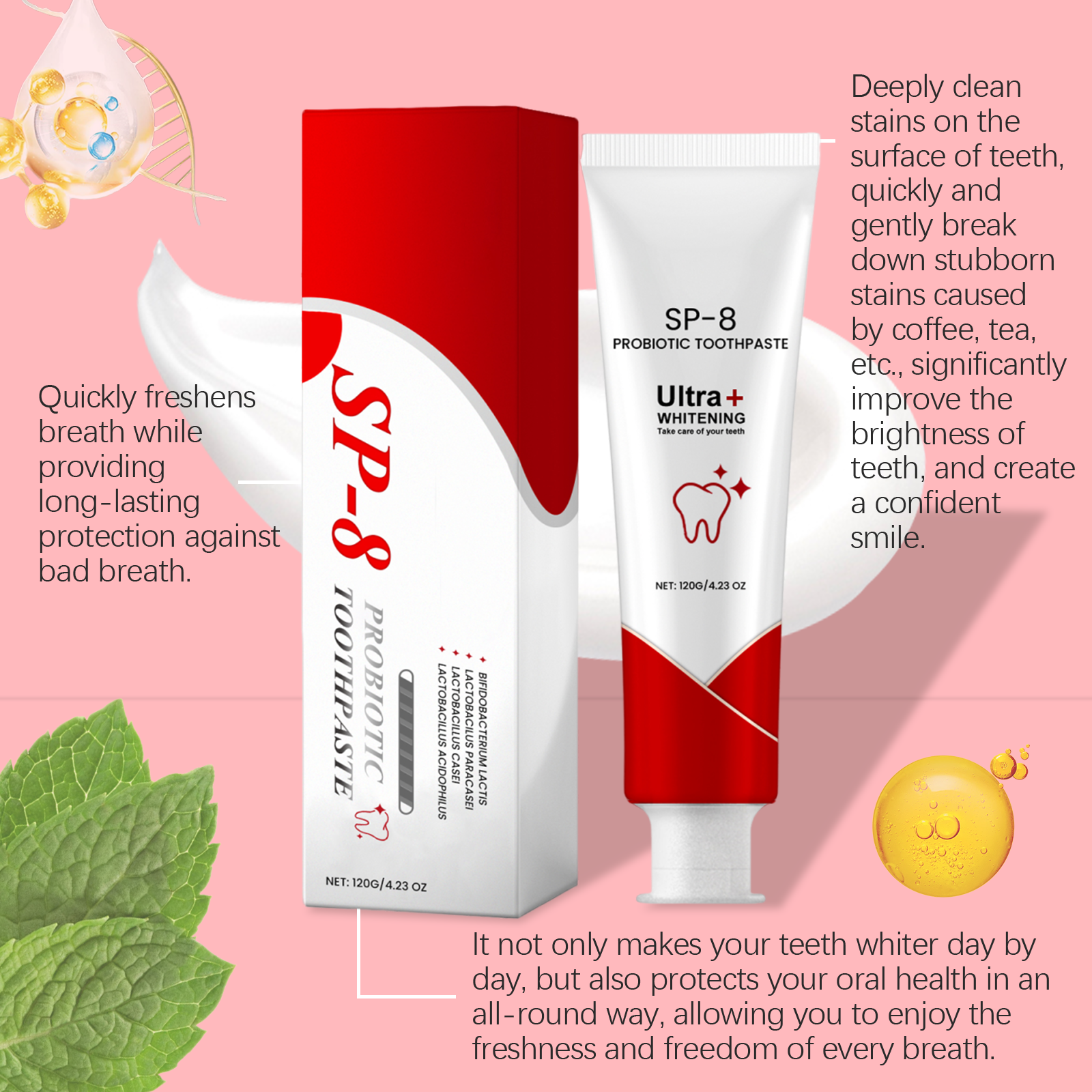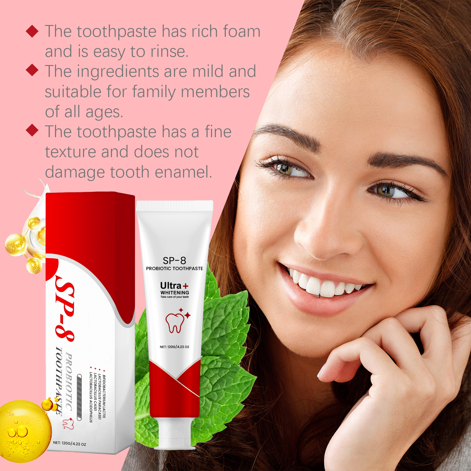 Our probiotic brightening toothpaste is carefully formulated with carbomer and sorbitol. Designed specifically to soothe the gums, alleviate the discomfort of brushing teeth and protect sensitive gums. The method of use is very convenient: take a proper amount of toothpaste on the toothbrush. Brush your teeth properly and clean your teeth and gums thoroughly. Finally, rinse it clean with clear water. It can also nourish and strengthen the teeth and build a protective layer.