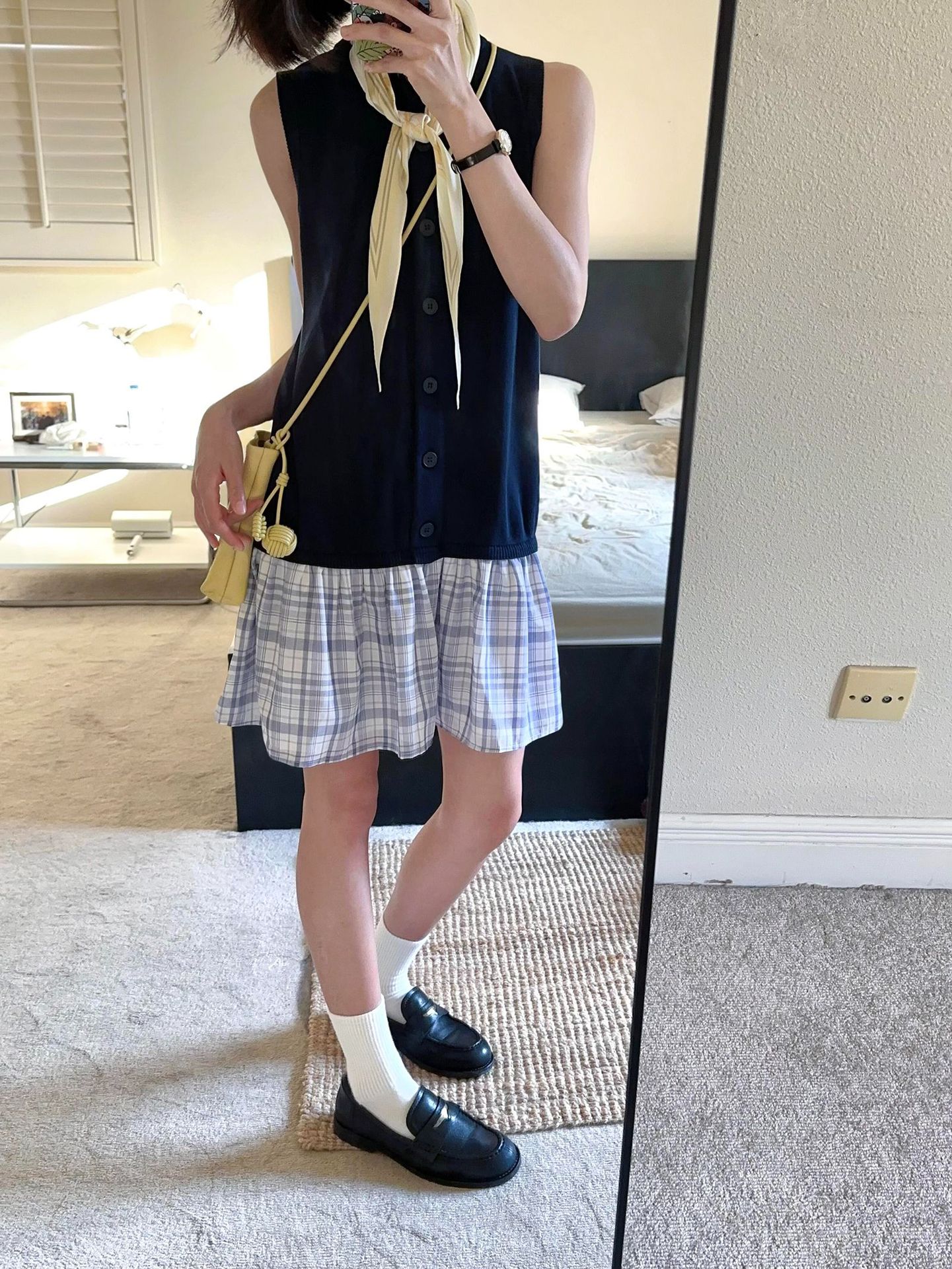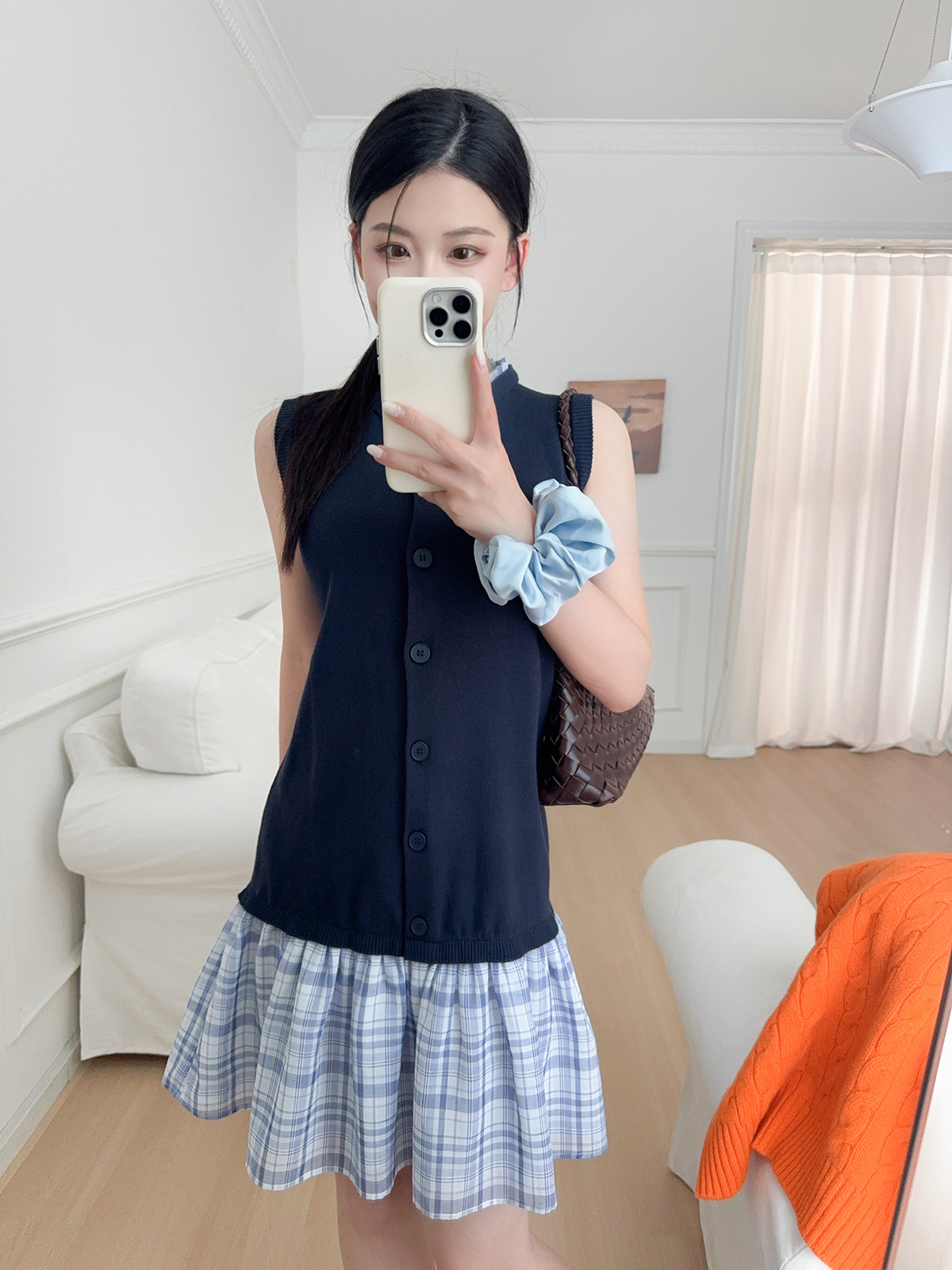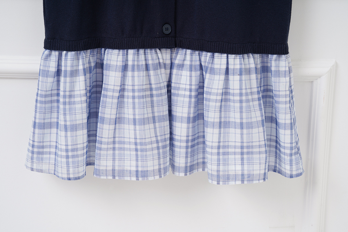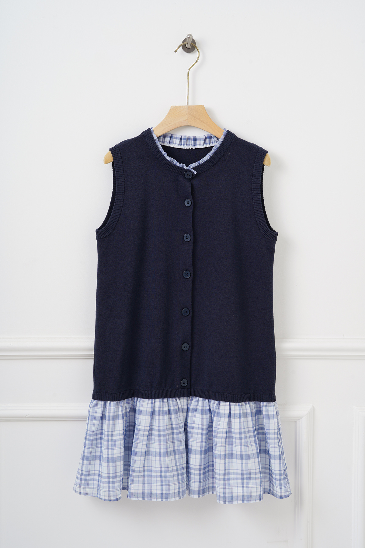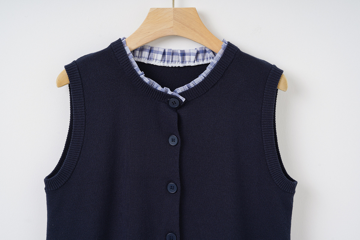 Color-blocked Knit Dress for Women, Plaid Hem, Ruffle Collar Sleeveless Midi Length Dress