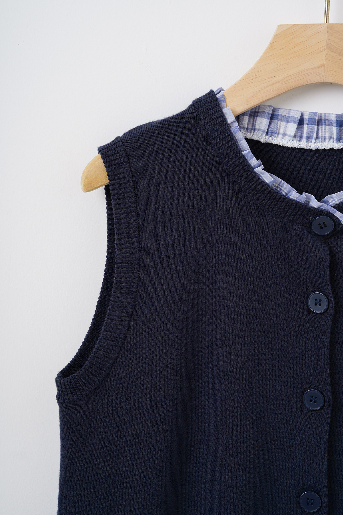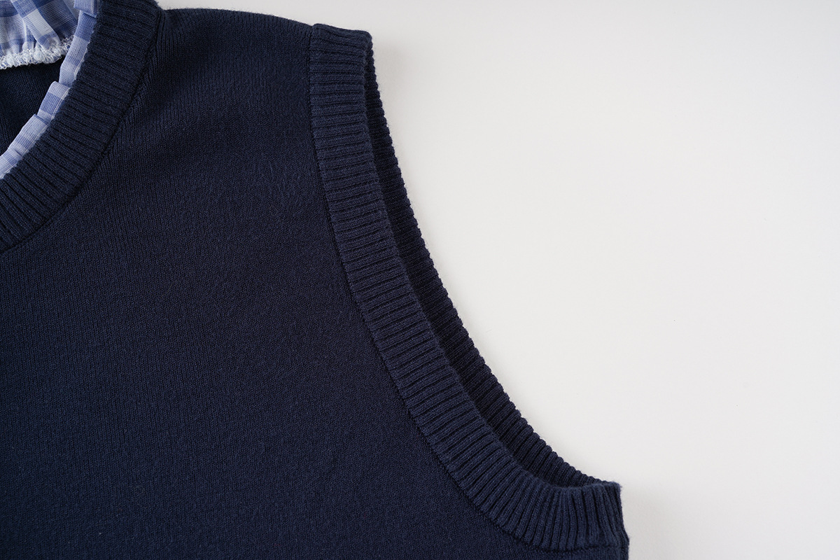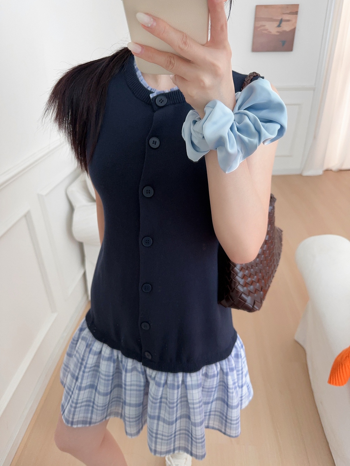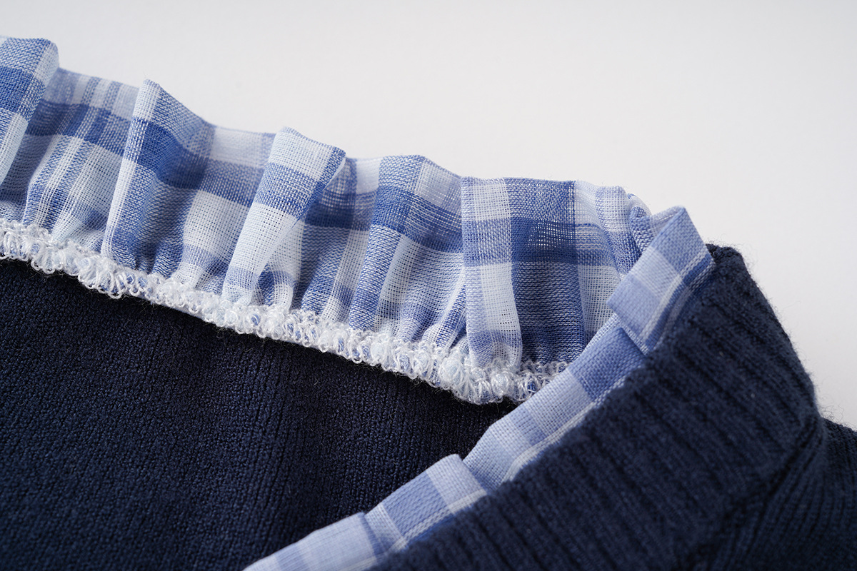 Color-blocked Knit Dress for Women, Plaid Hem, Ruffle Collar Sleeveless Midi Length Dress