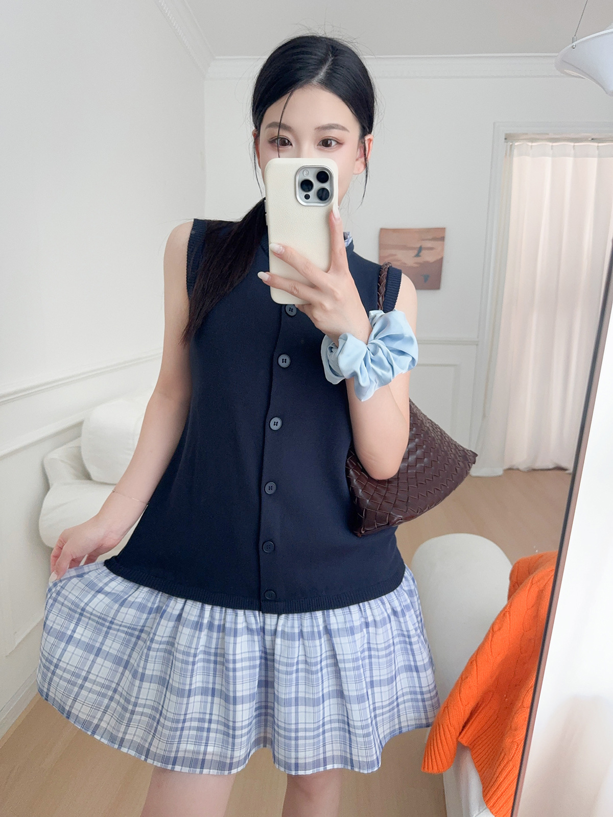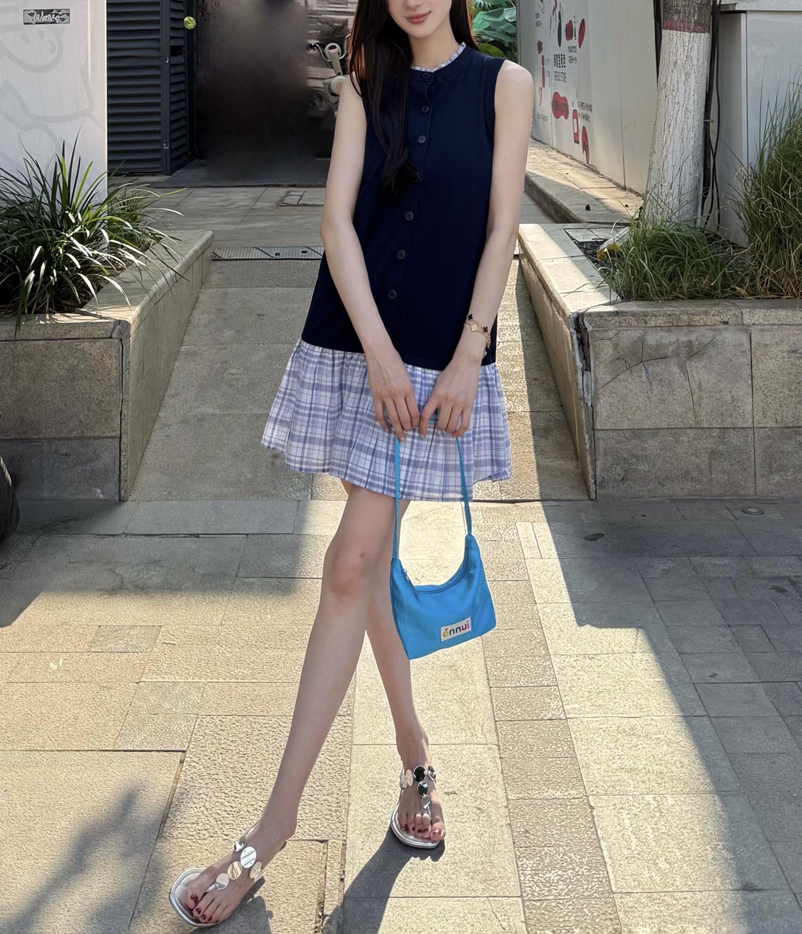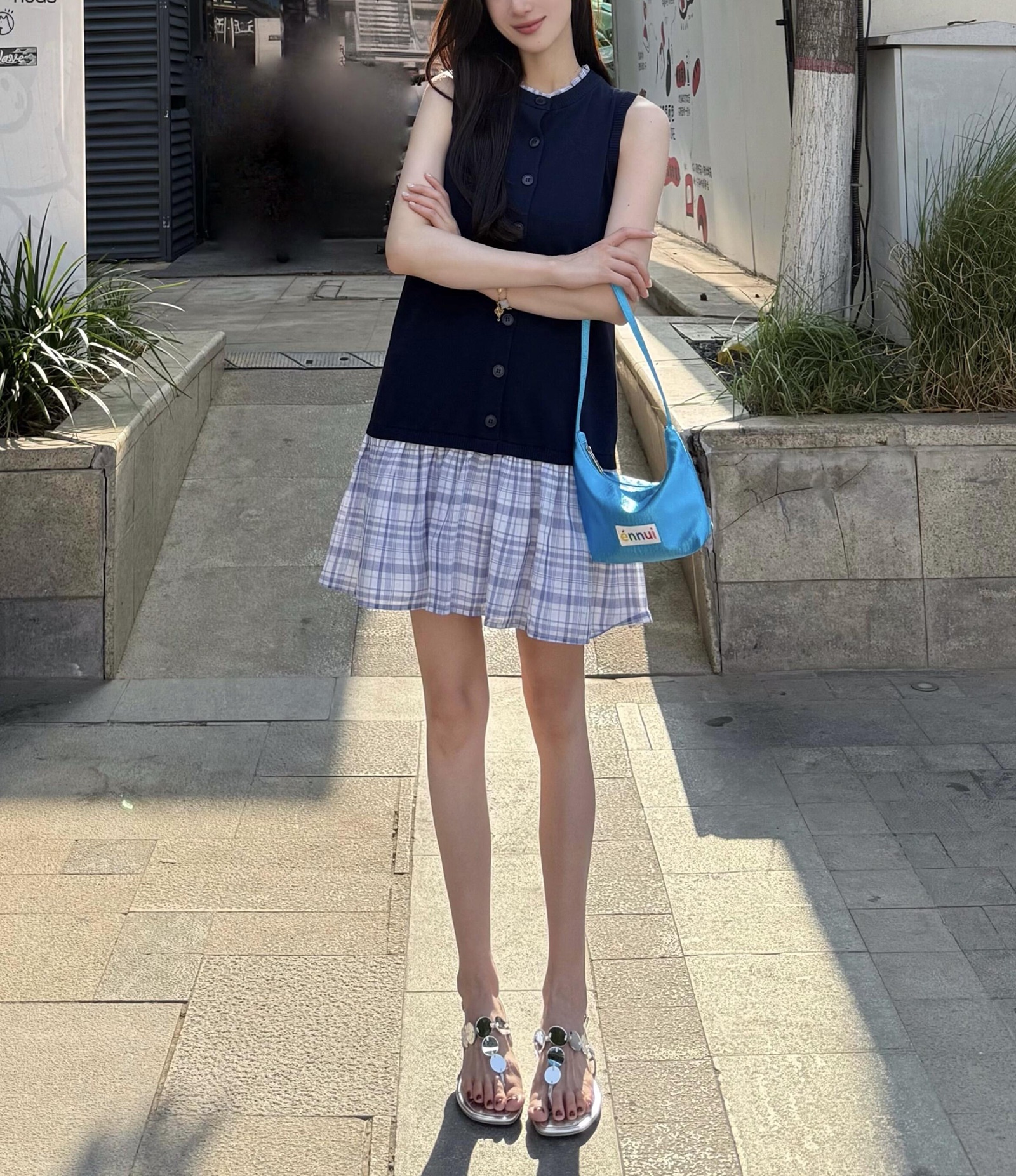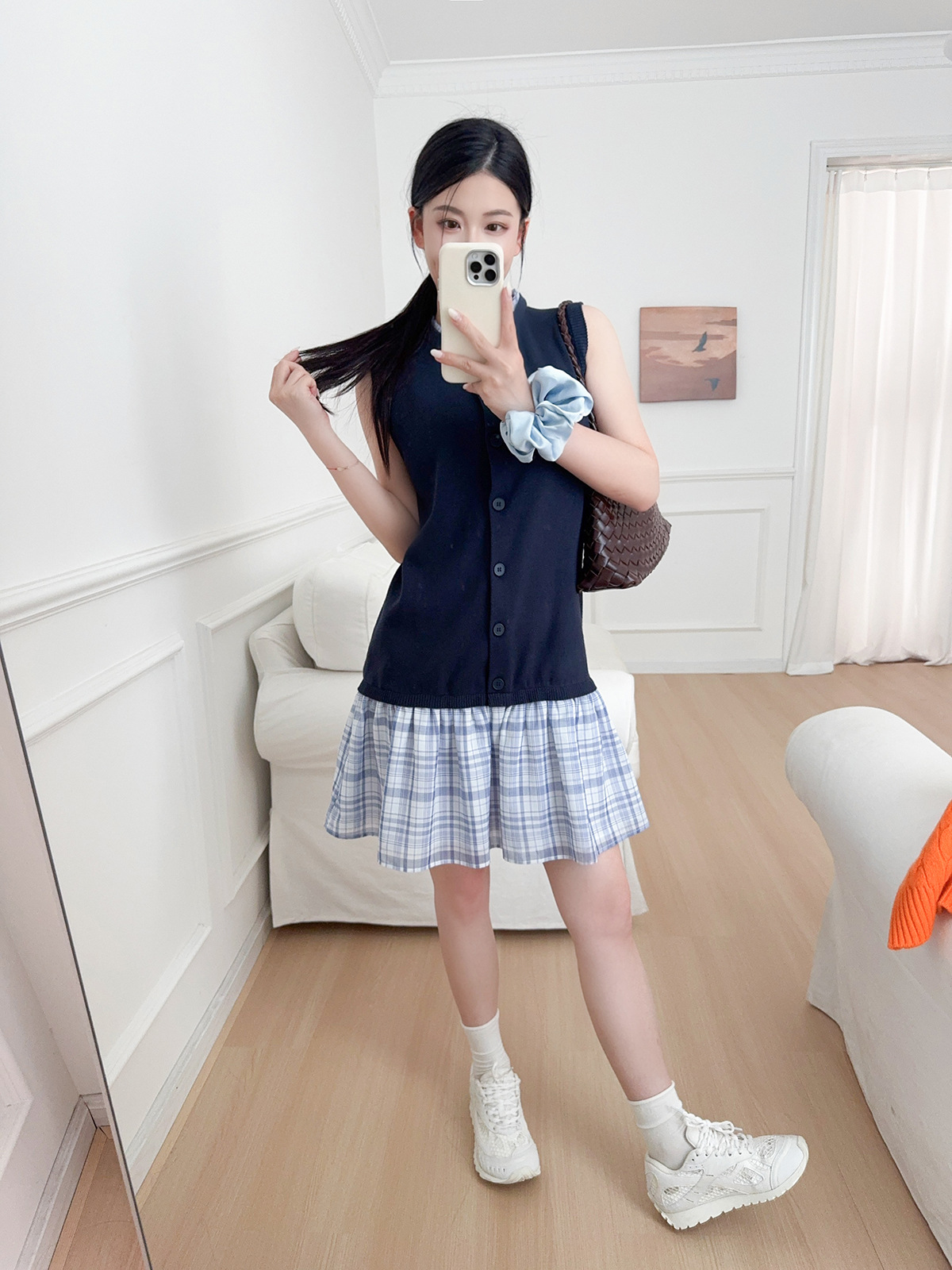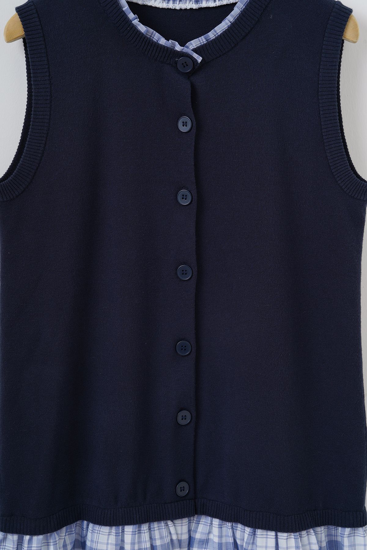 Color-blocked Knit Dress for Women, Plaid Hem, Ruffle Collar Sleeveless Midi Length Dress