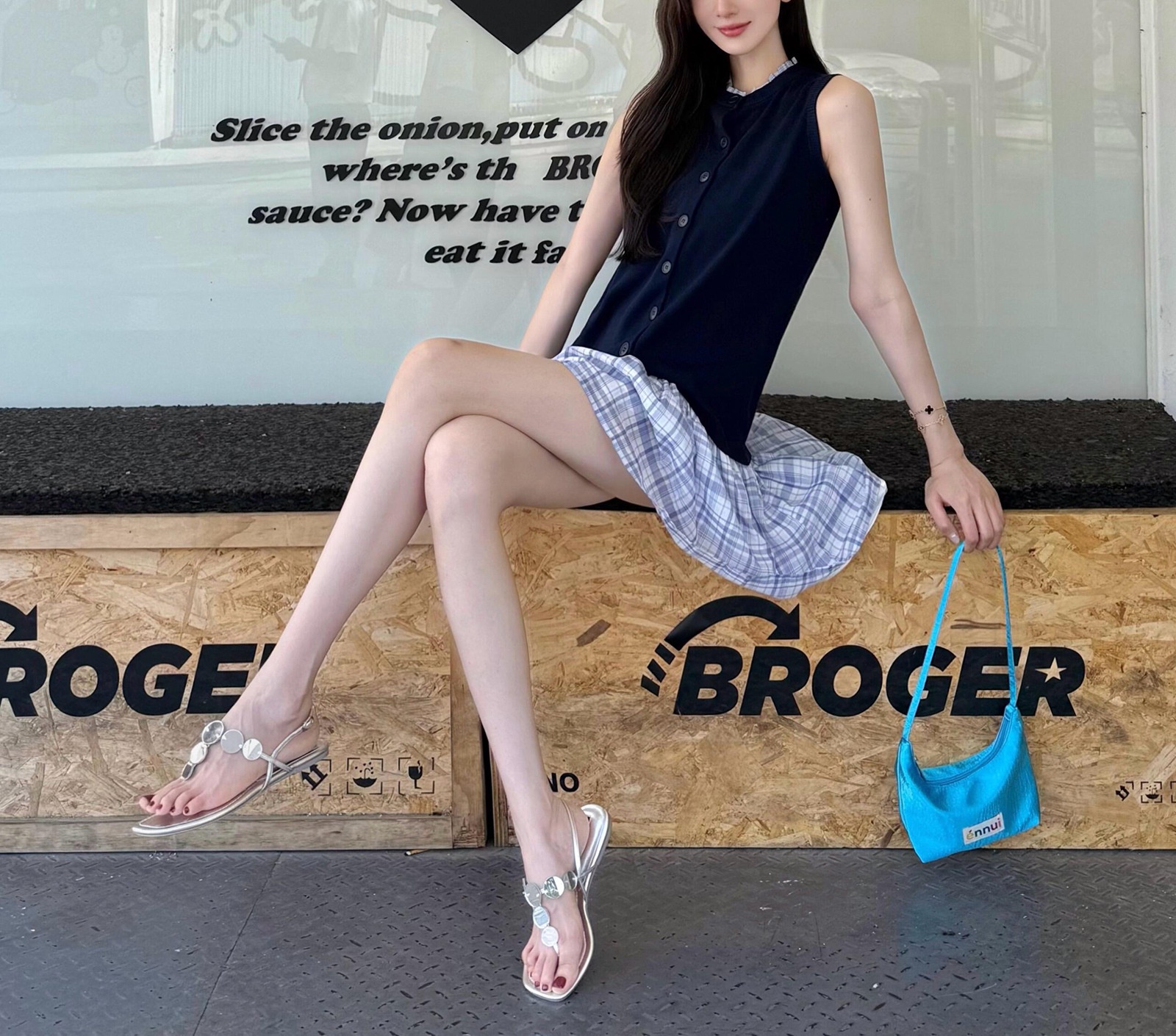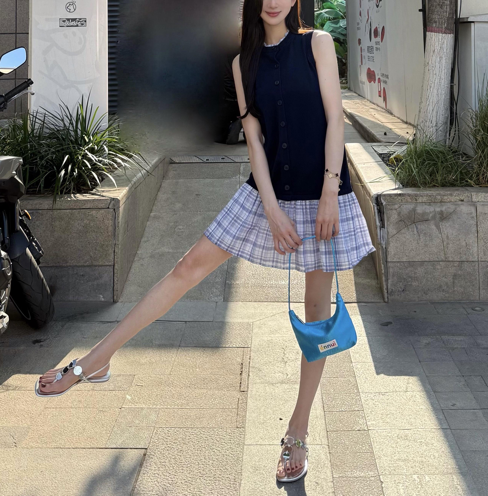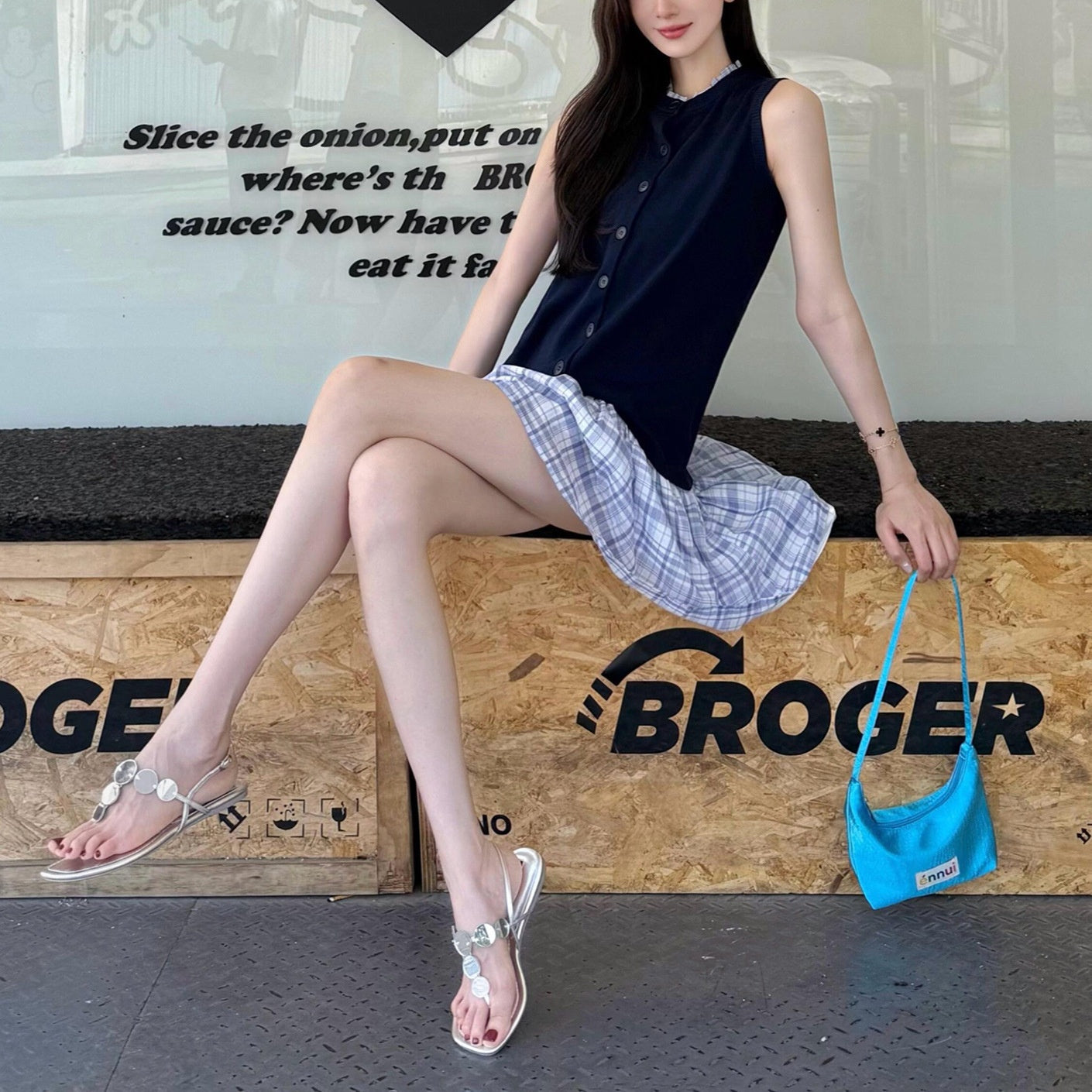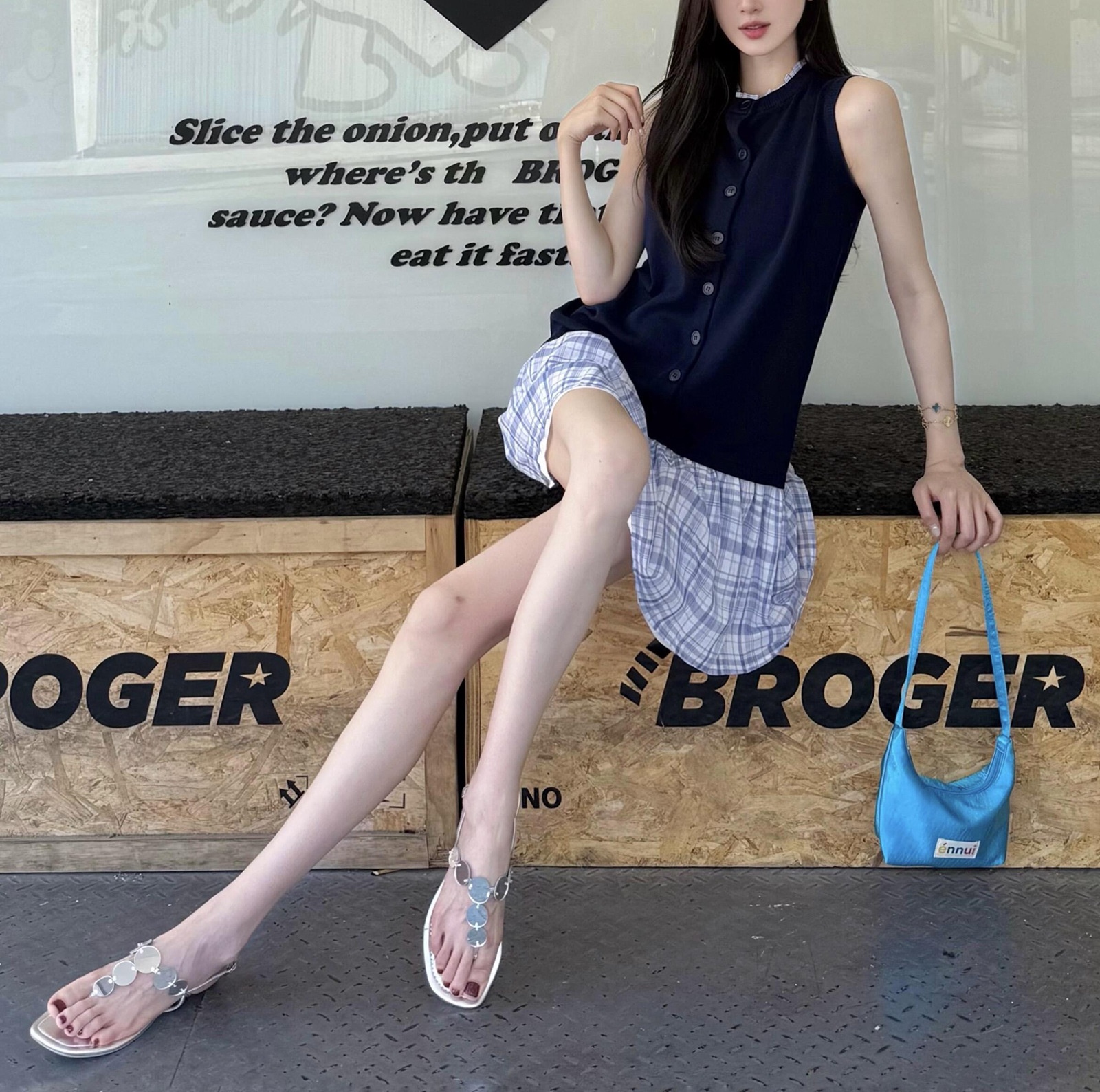 Color-blocked Knit Dress for Women, Plaid Hem, Ruffle Collar Sleeveless Midi Length Dress