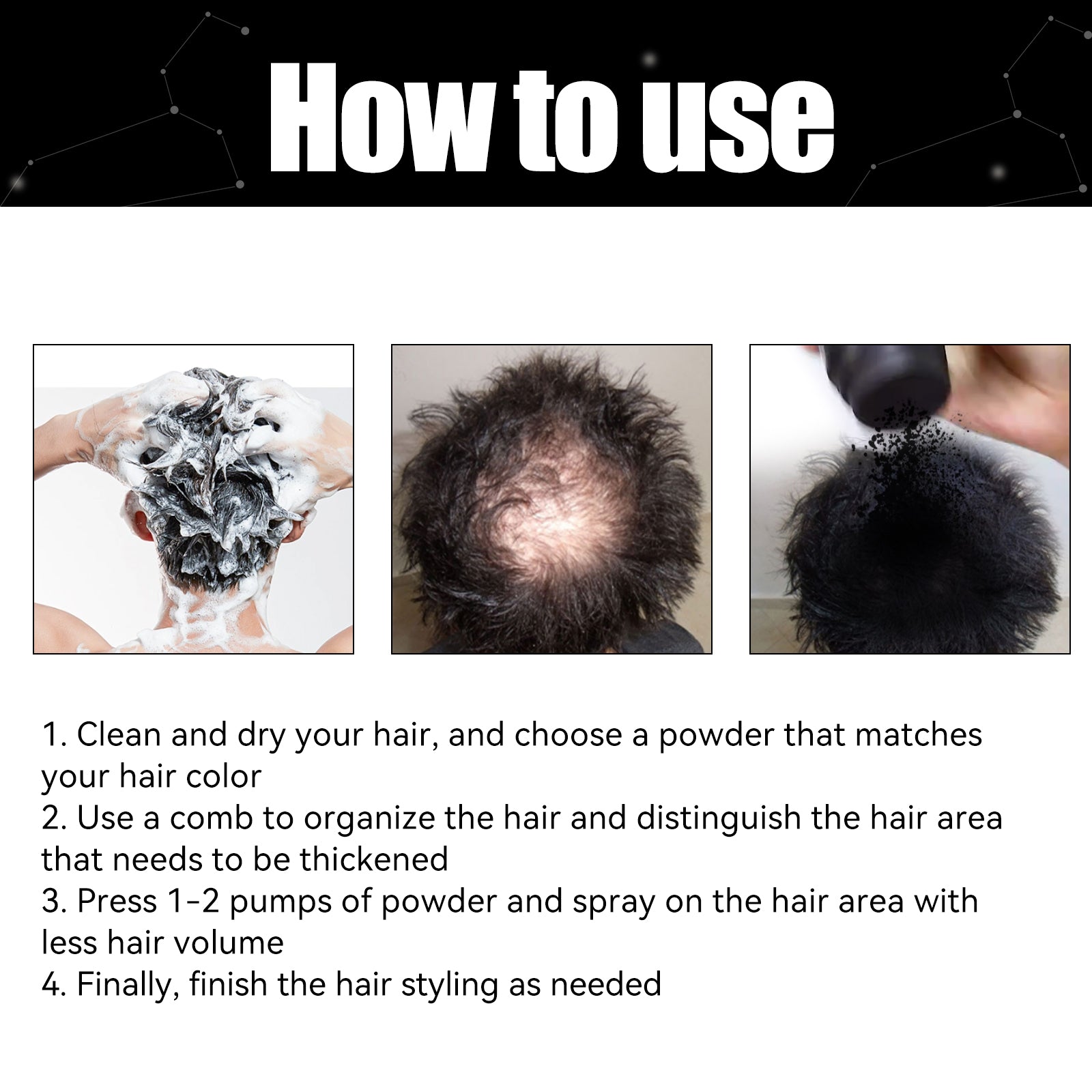Our hair thickening fiber powder is carefully formulated from modified corn starch and aluminum octenyl succinate. Specifically designed to provide immediate results for thickening hair fibers, it effortlessly covers bald areas, sparse regions and patches. The usage method is extremely convenient: 1. Clean your hair and dry it, then choose the powder that matches the color of your hair. 2. Use a comb to comb your hair and distinguish the areas that need to be thickened. 3. Spray 1-2 pumps of powder onto areas with less hair. 4. Finally, complete the hair styling as needed. And it can cover your sparse hair and bald spots on your temples, the top of your hairline and other areas, creating a thicker and fuller effect.