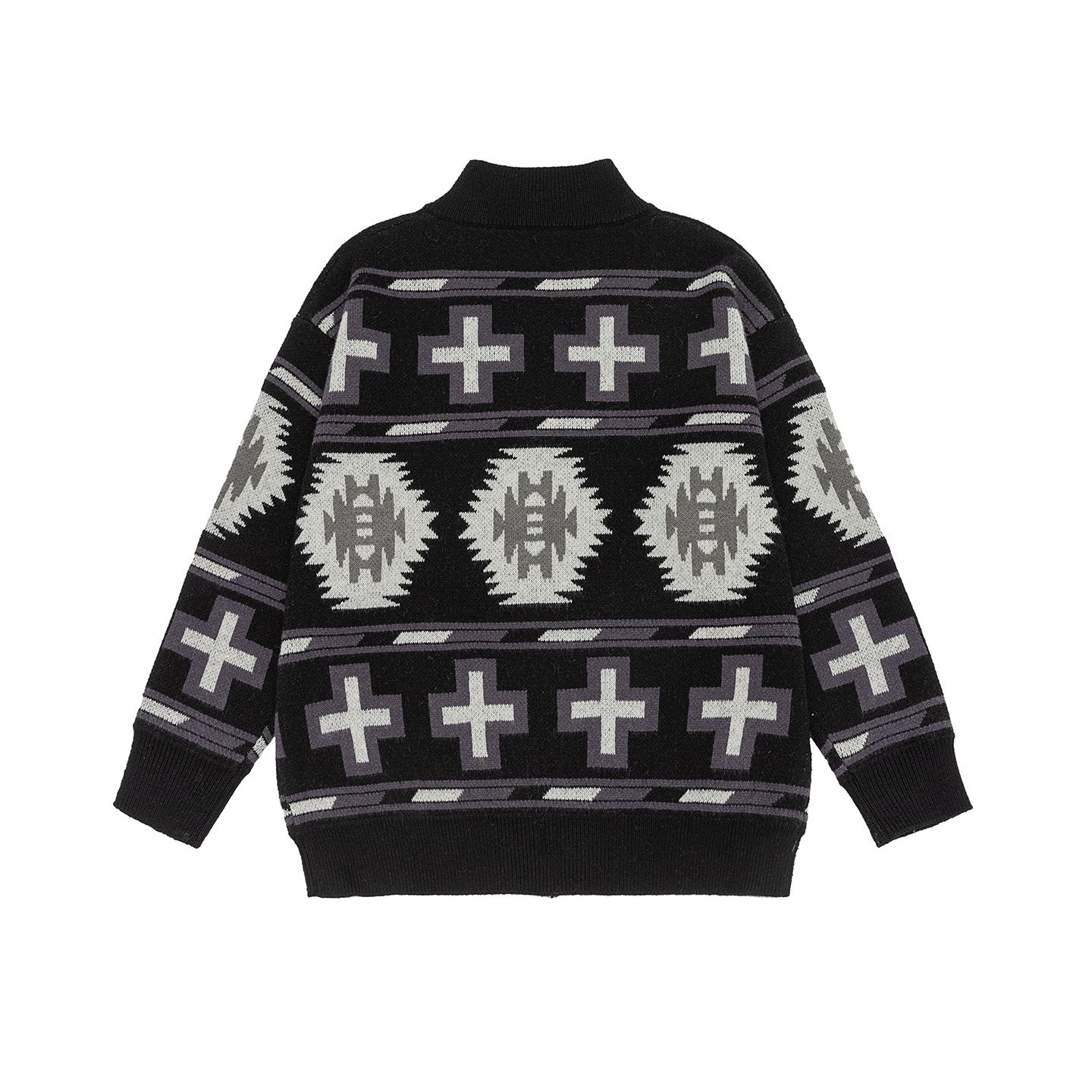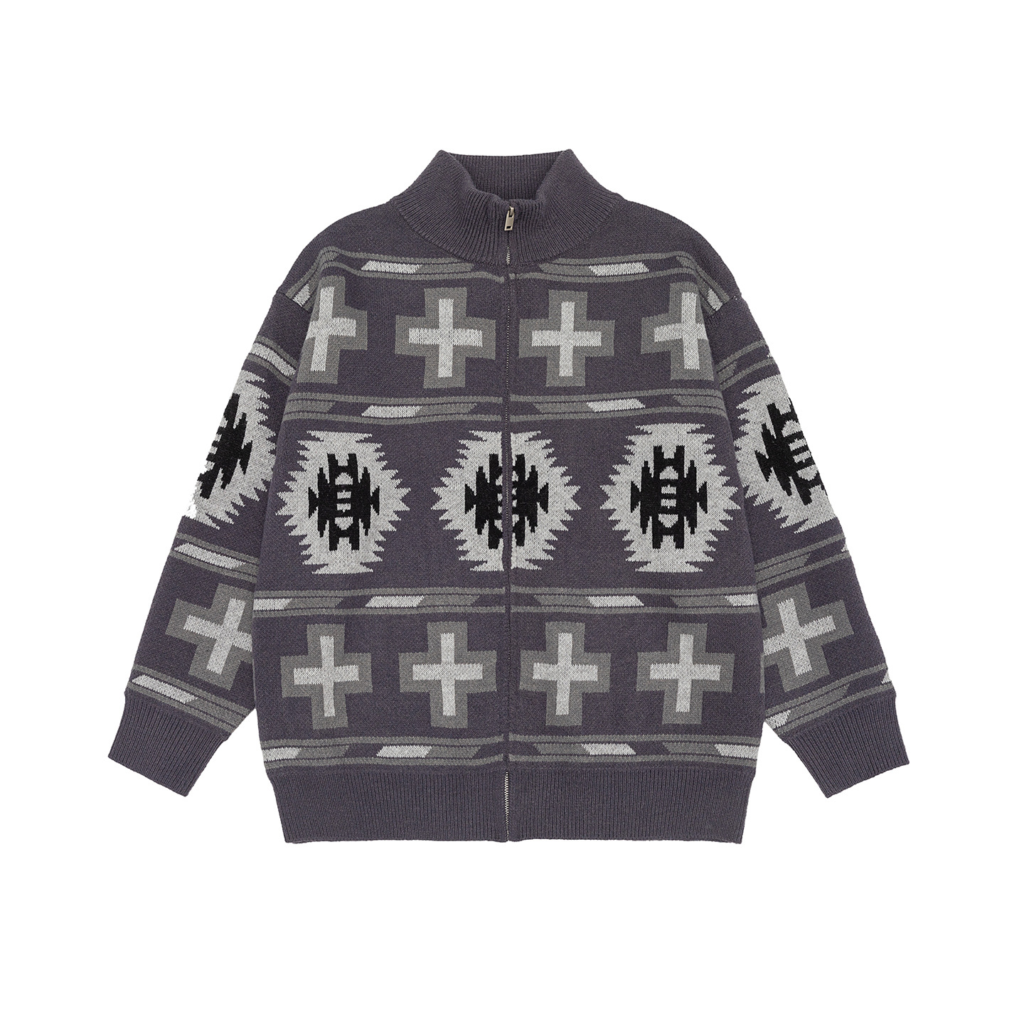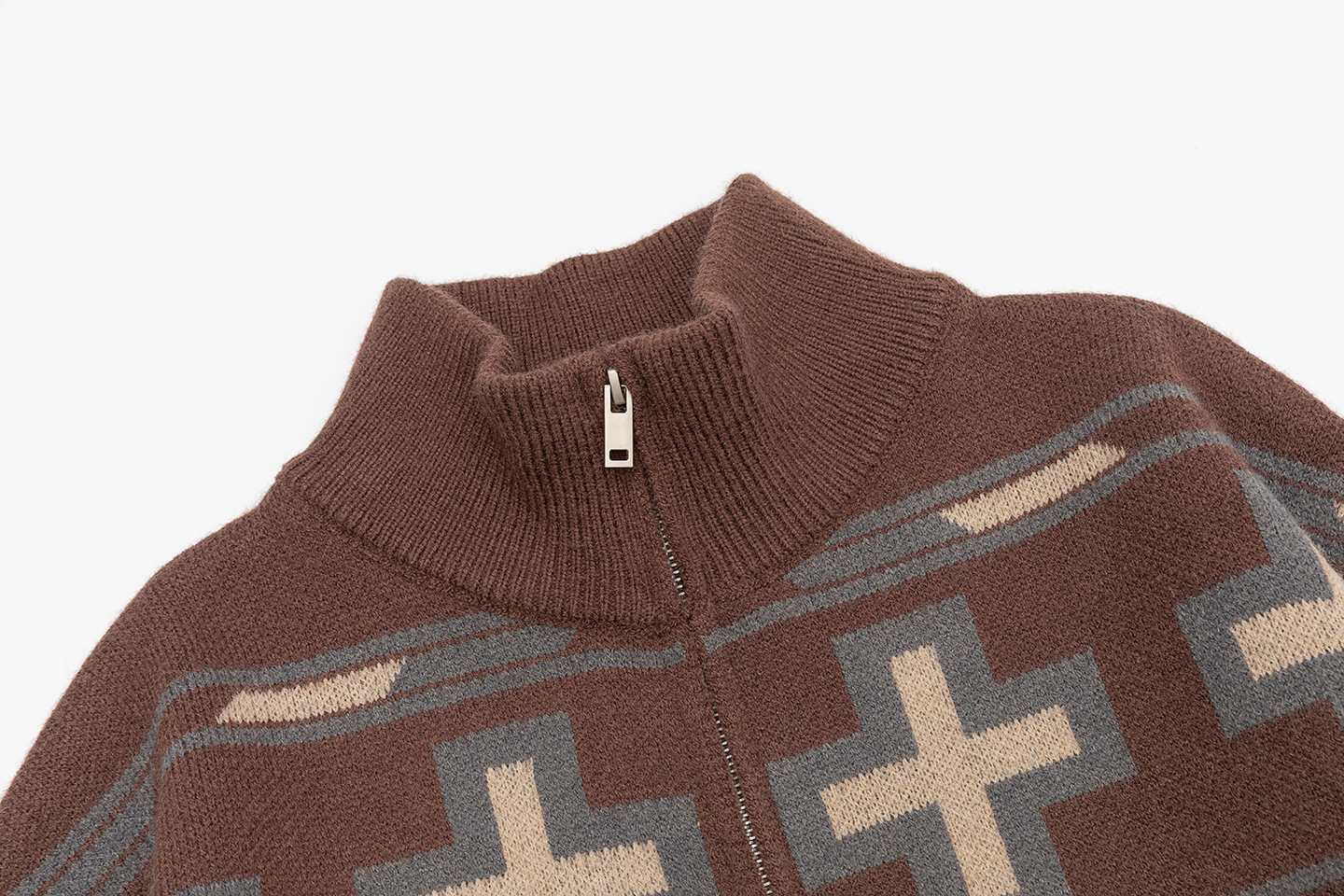 Fair Isle Knit Cardigan with Color-block Jacquard Pattern Loose Fit Zipper Closure Long Sleeve