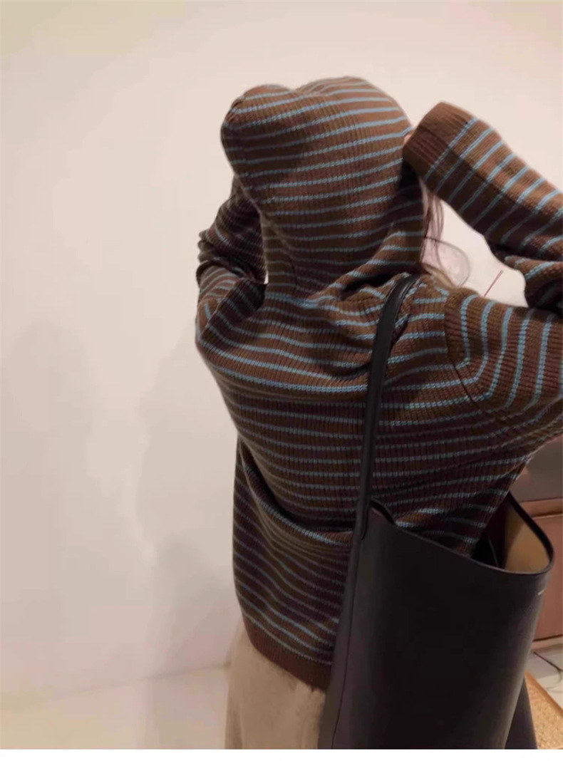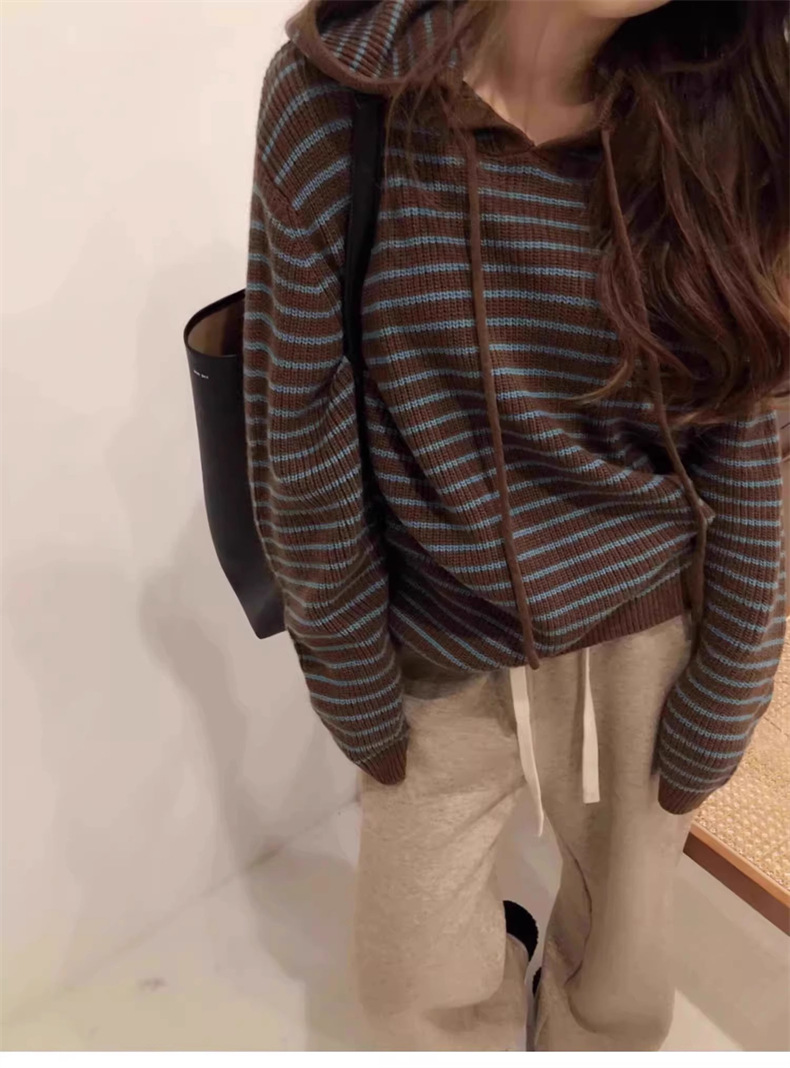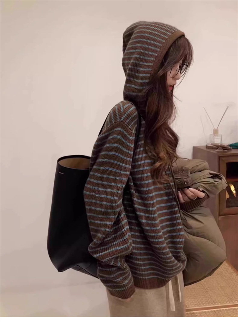 Hooded Striped Knit Sweater Coat for Women, Loose Soft Lazy Style Pullover Top