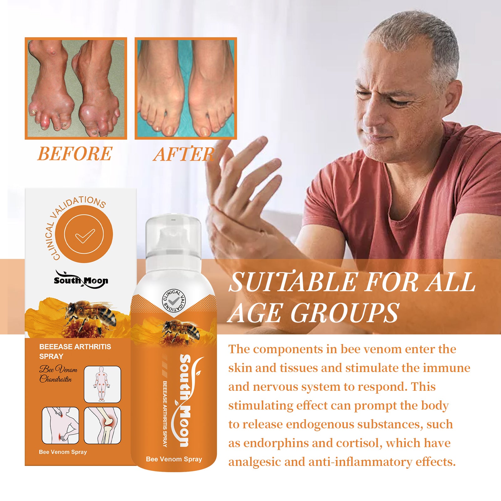 Our Beease Arthritis Spray contains bee venom, glucosamine, methyl sulfonyl methane. It can relieve bone and joint pain, eliminate inflammation, promote joint tissue repair, promote blood circulation, and improve joint flexibility. Its use method is very simple: clean and dry the skin of the joint, spray on the joint skin evenly 2-3 times, and gently massage with the hand in a circular motion until absorbed. Relieve arthritis pain, eliminate cysts and edema, and promote joint tissue repair.